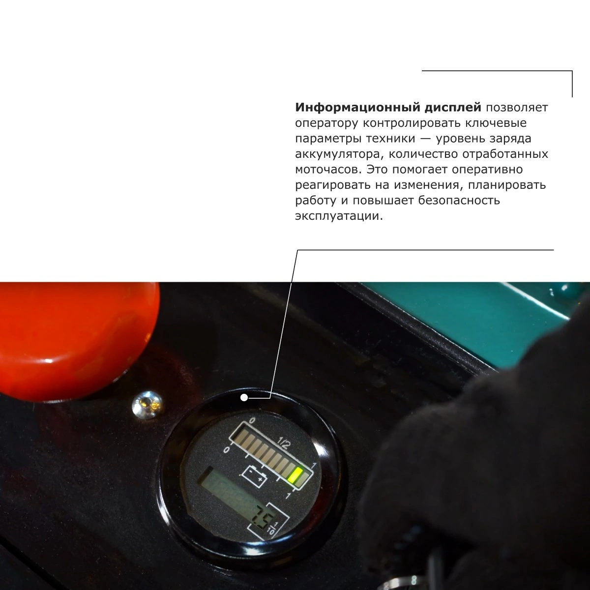 - Информационный дисплей позволяет оператору контролировать ключевые параметры техники — уровень заряда аккумулятора, количество отработанных моточасов. Это помогает оперативно реагировать на изменения, планировать работу и повышает безопасность эксплуатации.