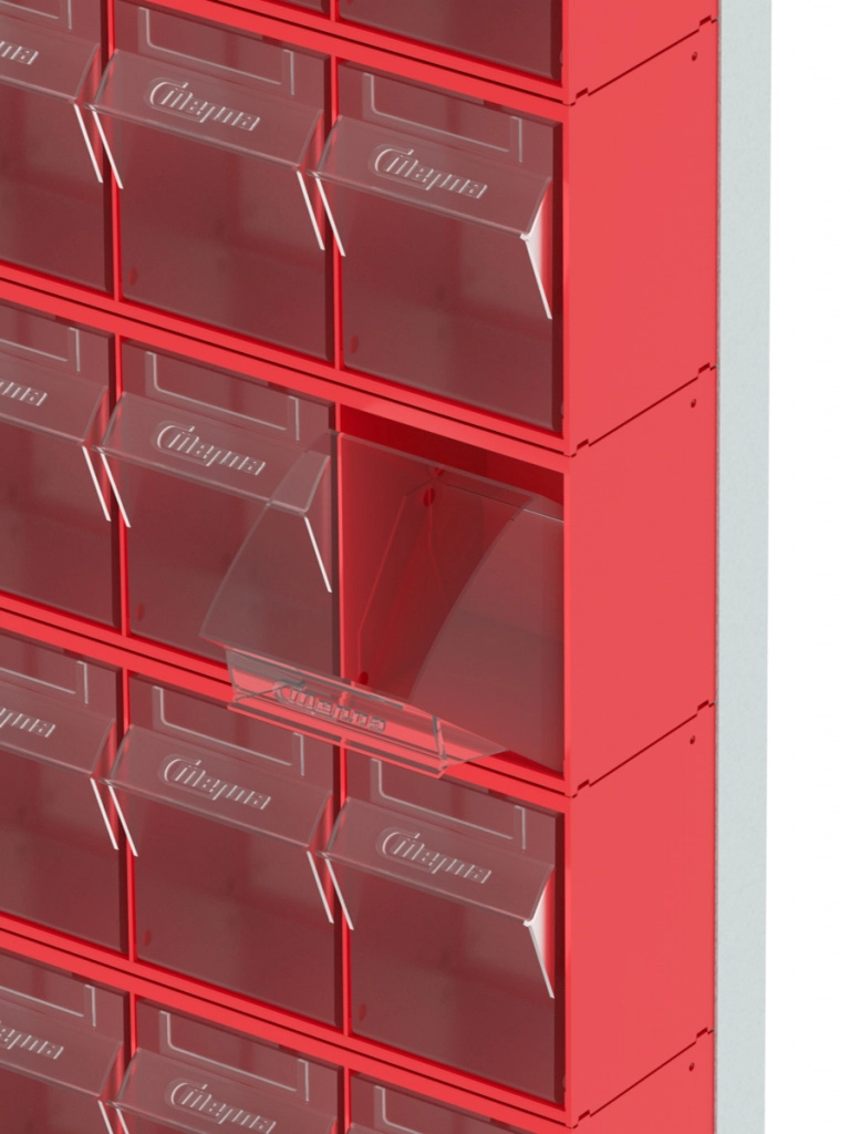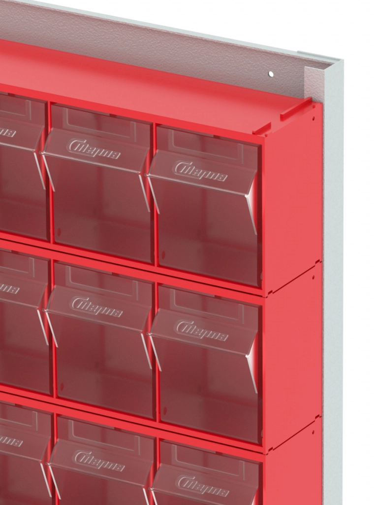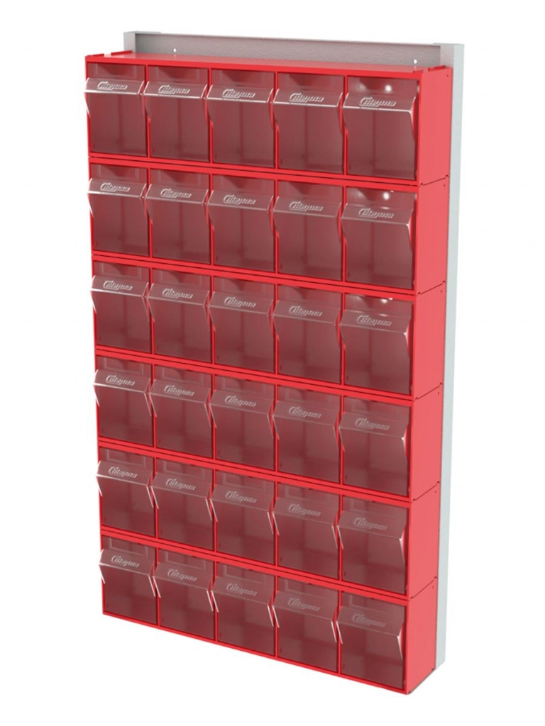 Стойка настенная Стелла-техник 402-00-00-06 (610х40х1000) представляет собой удобную систему хранения на основе откидных коробов, которая подойдет для использования в выставочных залах, магазинах, складах. Стойка крепится на стену при помощи саморезов или анкерных болтов (крепеж не входит в комплект и подбирается под уровень загруженности стойки). Комплектация: Рама FOX (610х40х1000) V402 - 1 шт.; Короб откидной Стелла-техник F-600-5 , 600х140х168мм, 5 ячеек, красный, прозрачный - 6 шт.; Упаковка. Преимущества стойки с откидными коробами: Металлическое основание; Значительная устойчивость; Хорошая вместимость; Длительный срок службы.