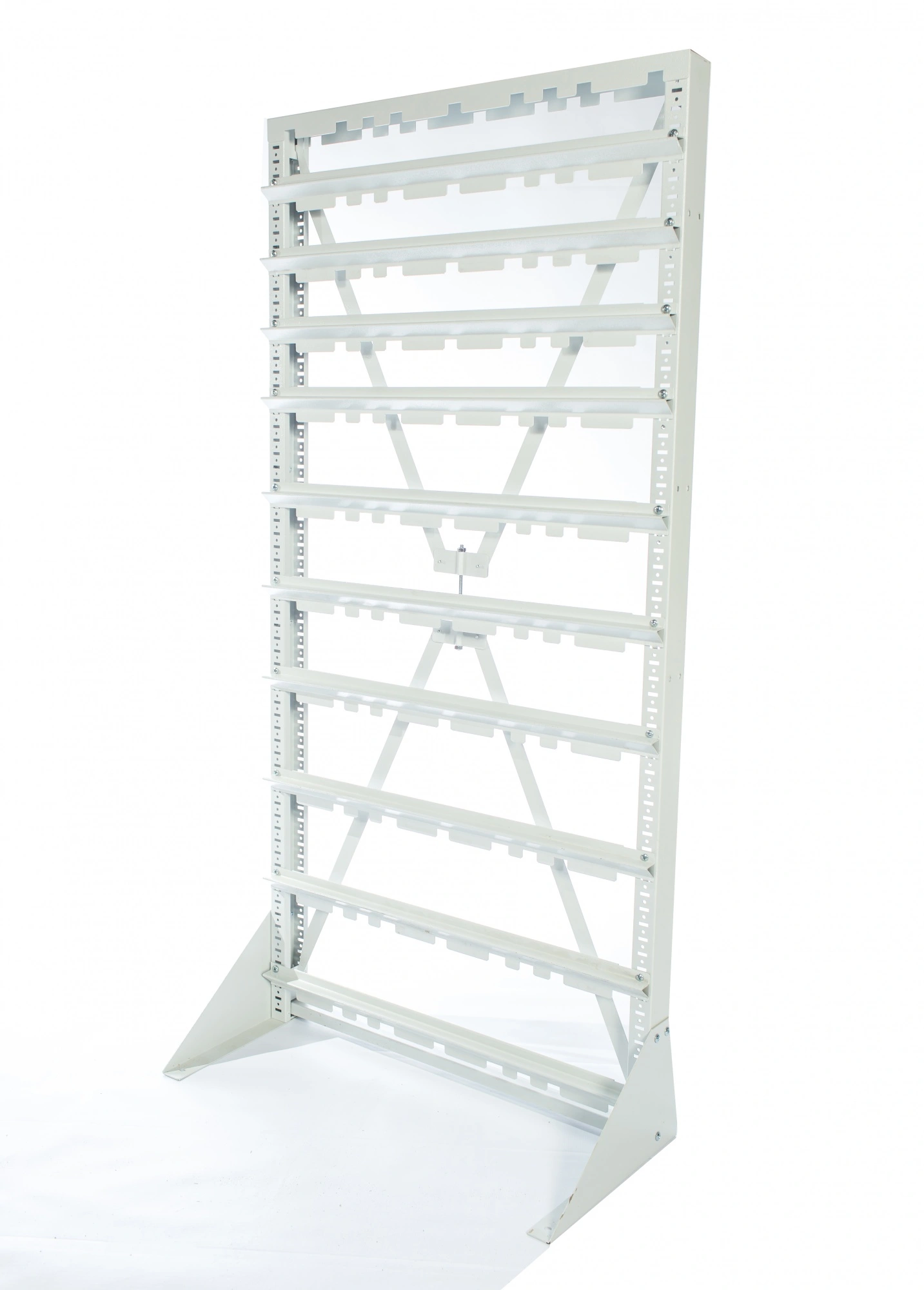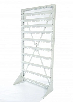 Стойка Стелла-техник V-735х2020мм. без опоры, серия К, для пластиковых ящиков, состоит из металлической рамы, снабженной крестовиной-растяжкой для жесткости конструкции. На вертикальных стойках рамы имеются перфорационные отверстия для закрепления поперечных держателей. Держатели крепятся к раме с помощью саморезов. Высоту держателей можно изменять в зависимости от высоты закрепляемых пластиковых ящиков. В случае необходимости, стойка может закрепляться на передвижной платформе, специально предназначенной для этой цели. В комплект поставки входят: Вертикальная стойка перфорированная 2 шт.; Верхняя планка-опора 1 шт.; Полукрестовина для стяжки стойки 2 шт.; Шпилька резьбовая диаметр 8мм. для стяжки полукрестовин 1 шт.; Гайка М8 для шпильки резьбовой 2 шт.; Шайба М8 для шпильки резьбовой 2 шт.; Саморезы диаметр 6мм. на 1 держатель 2 шт.